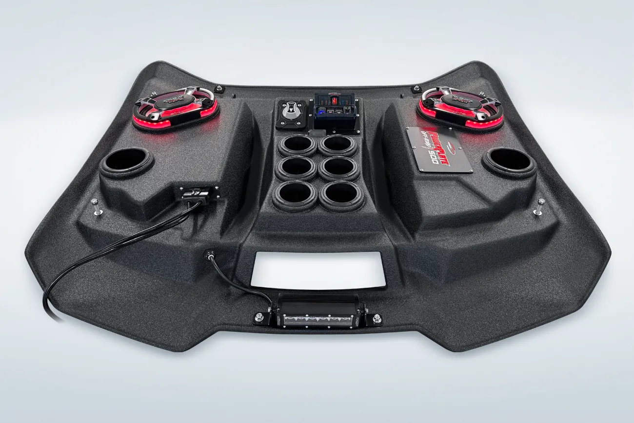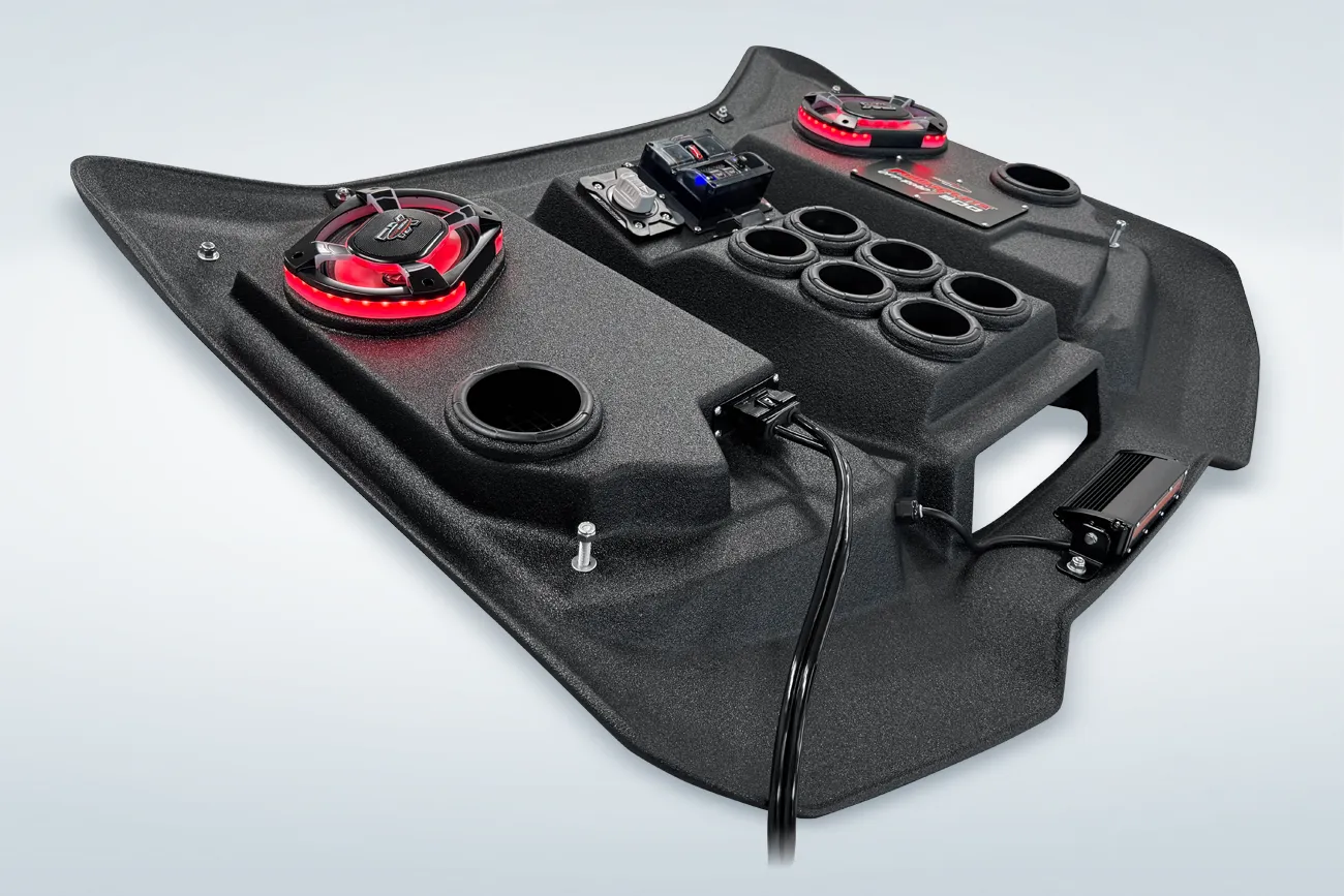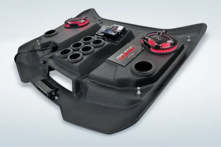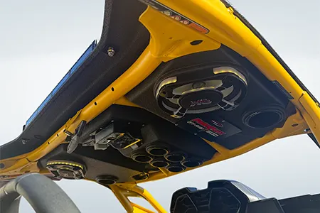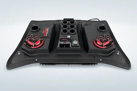 The ProBox 6x9 component speakers have been designed without a center pole behind the mid/tweeter. Instead, the mid/tweeter are suspended above the cone, making the 6x9 a true woofer with excellent bass response. This design also allowed us to mount the optional waterproof RGB LED circuit board behind the mid/tweeter. A reflective coating on the cone enhances the colors from the RGB LED circuit board, creating most impressive results.