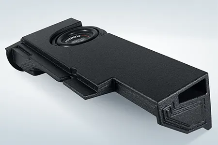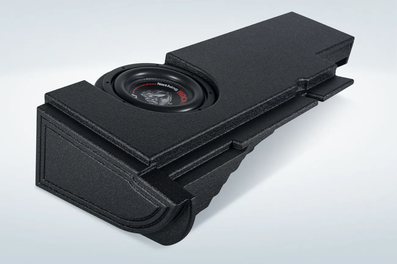 The new body Chevy Extended Cab presents a bit of a challenge due to the constant changes in floor pan elevation. Our layered design follows the contours of the floor on both the left and right sides of the truck, maximizing the air space in the enclosure and yielding phenomenal results that exceed a generic downfire box with two generic/universal run-of-the-mill subs.