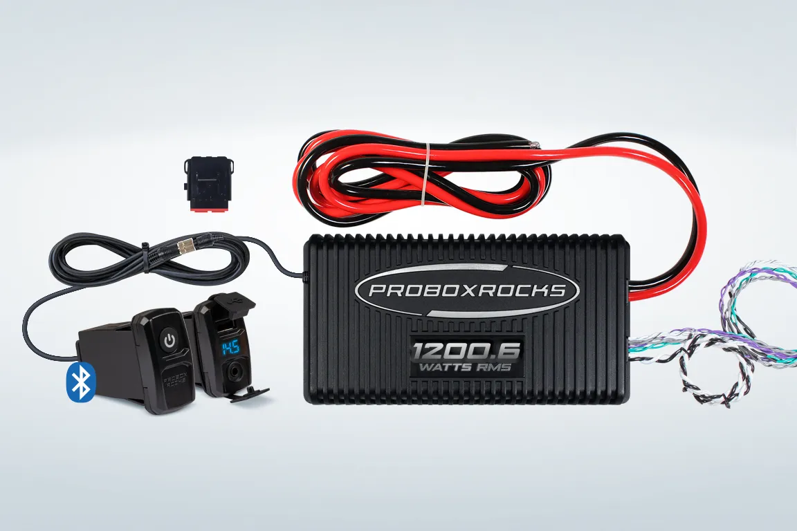 The PBR1200.6 is a revolutionary new product that provides a complete solution for streaming amplified Bluetooth audio from your mobile device to your off-road ProBox tower speakers. The kit includes a 1200.6 watt amp, Bluetooth® and USB/AUX modules that pop into any standard rocker switch slot, fuse holder, and all the wiring you will need.