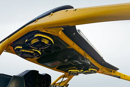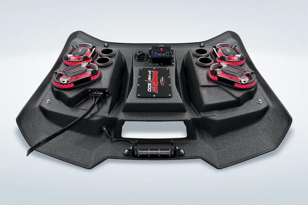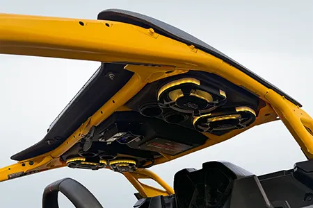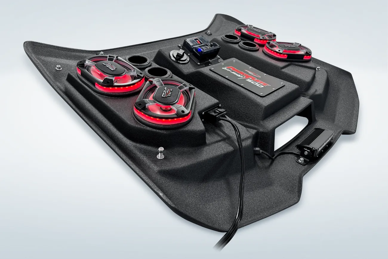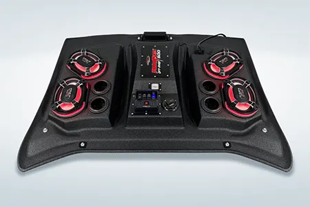 The ProBox 6x9 component speakers have been designed without a center pole behind the mid/tweeter. Instead, the mid/tweeter are suspended above the cone, making the 6x9 a true woofer with excellent bass response. This design also allowed us to mount the optional waterproof RGB LED circuit board behind the mid/tweeter. A reflective coating on the cone enhances the colors from the RGB LED circuit board, creating most impressive results.