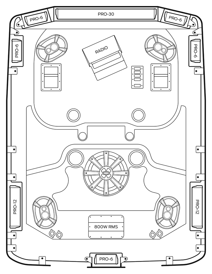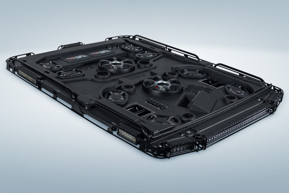 The JK4 ProBox top is the must have accessory for your Jeep Wrangler JK 4-door. The JK4 features 8 ProBox marine 6x9 components, the 400 W ProBox Plate Amp, and super bright LED lighting, all integrated into a single roof system that attaches with just six bolts and a couple of quick release power connectors. It's everything you've always wanted for your Jeep, all in one package.
